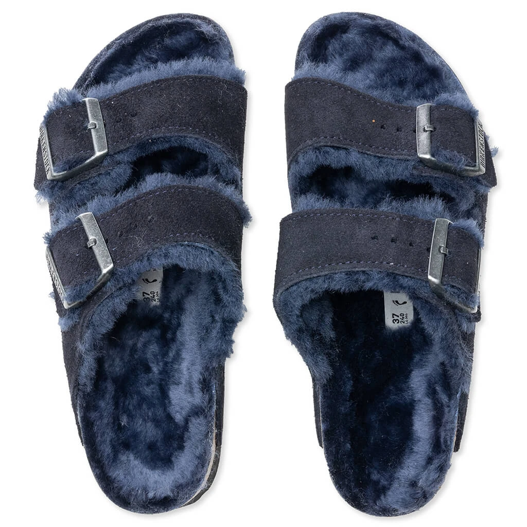 Perfect for chilly evenings, the Birkenstock Women’s Narrow Arizona Shearling features the classic anatomically-shaped cork-latex footbed along with suede straps. The footbed lining comprises genuine shearling, while the two straps include adjustable metal pin buckles. The EVA outsole underneath protects the design.