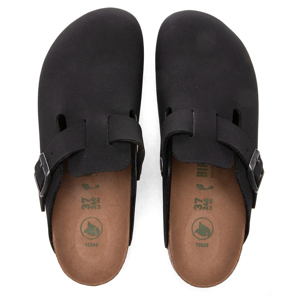 The Birkenstock Women’s Narrow Boston Vegan Birkibuc is an essential year-round sandal to keep within your footwear rotation. Featuring all vegan materials, the silhouette incorporates a Birkibuc upper with a microfiber footbed lining. The anatomically shaped cork-latex footbed offers premium comfort, while the individually adjustable metal pin buckles within the two straps offer a functional experience. The EVA outsole completes the aesthetic.