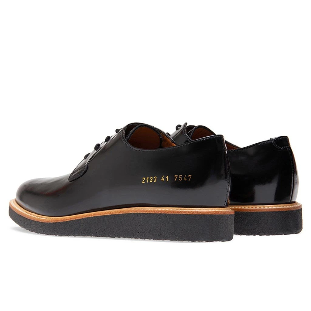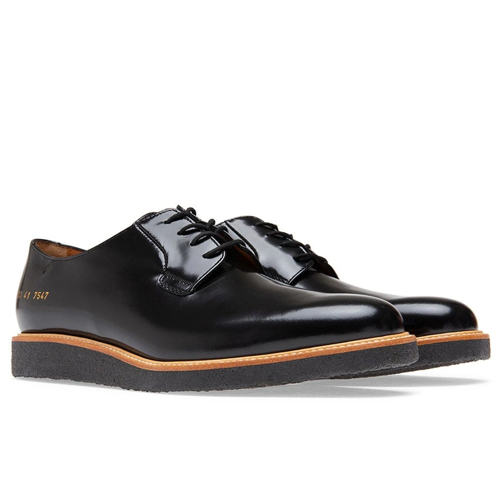 Founded by Prathan Poopat and Flavio Girolami in 2004, Common Projects are best known for their signature gold stamp at the heel highlighting style and size. Assembled in Italy using the highest-quality materials, these men’s formal shoes push the standard in luxury footwear. Pictured is the Common Projects Derby Shine in Black.