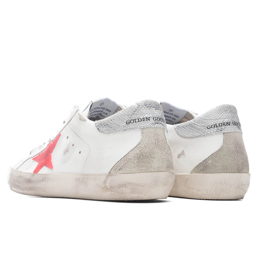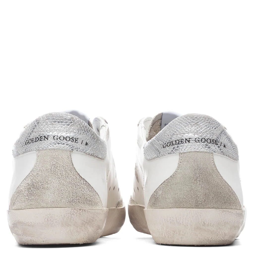 Elevate your go-to pair of sneakers with the latest rendition of the Golden Goose Womenโs Super-Star. Featuring a leather and suede upper, this signature design spotlights a lace-up front with logo detailing placed throughout. Perforated sides make an appearance, while the lining consists of a blend of leather and terrycloth. A signature star patch makes its way to the side, while the snake-embossed metallic leather back counter. Intentional distressing are placed throughout, while the rubber outsole completes the design.