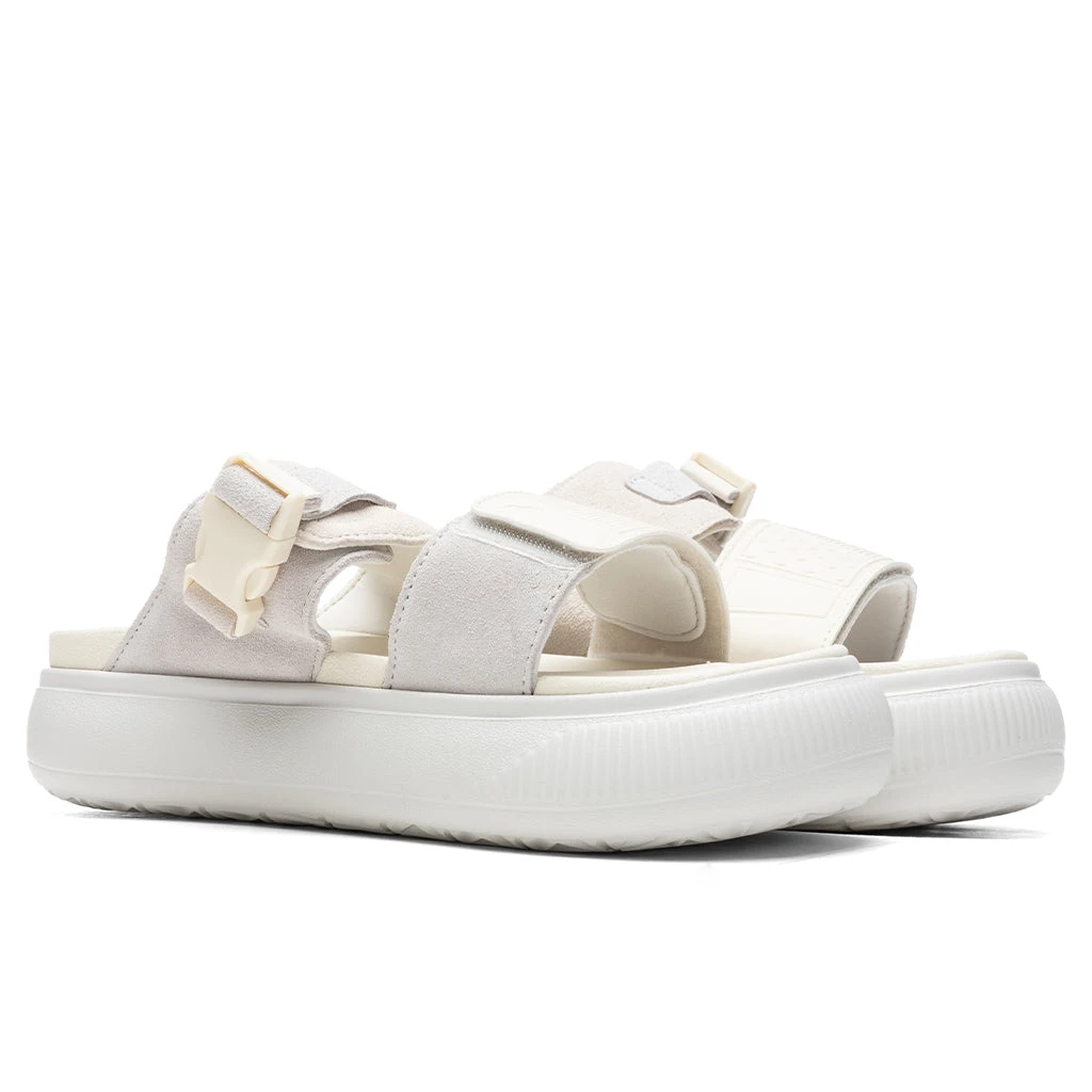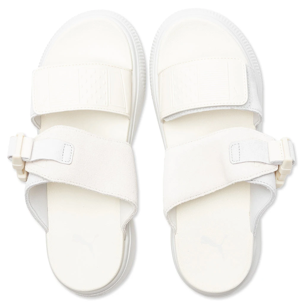 Incorporate a futuristic aesthetic with the Puma Suede Mayu Sandal Women’s. Composed of synthetic leather in the straps, the vamp strap features a hook-and-loop fastening and a Puma Cat logo. The second strap also features a TPU buckle, while the molded footbed displays screen-printed Puma branding as well. The IMEVA midsole and outsole provide additional comfort with each step. The slip-on silhouette is finished with a leather label and debossed Puma branding.