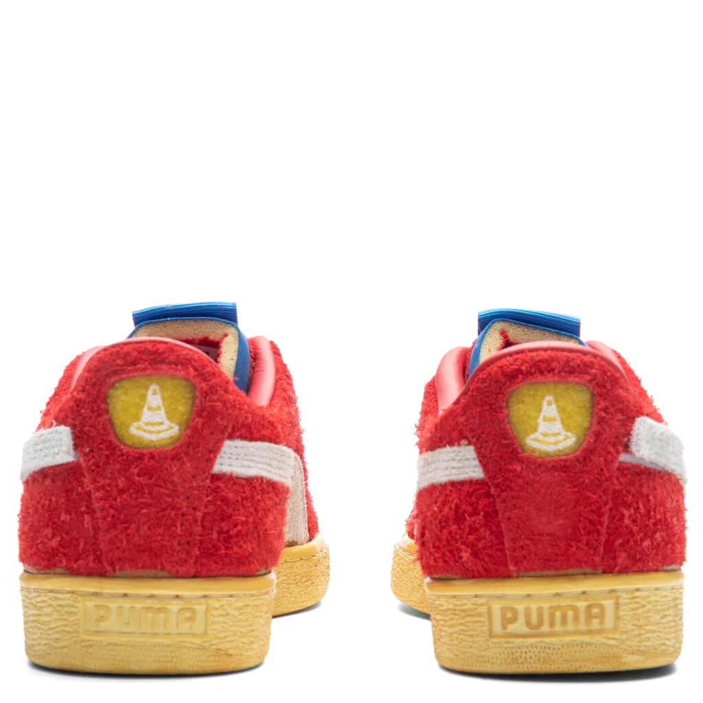 PUMA and sports car manufacturer Ferrari joins Southern California artist Joshua Vides to create a collection of motorsport-themed sneakers and apparel. The Ferrari Suede sneaker showcases Joshua Vides’ signature pop-art style, adding a unique twist to Puma’s classic Suede silhouette. The hairy suede material adds dimension, while the lace closure and rubber outsole add function and complete the look.