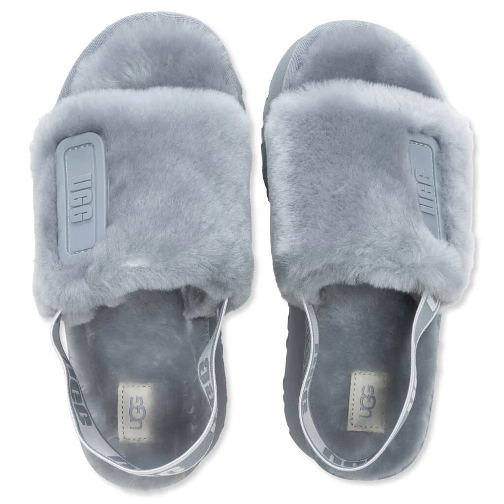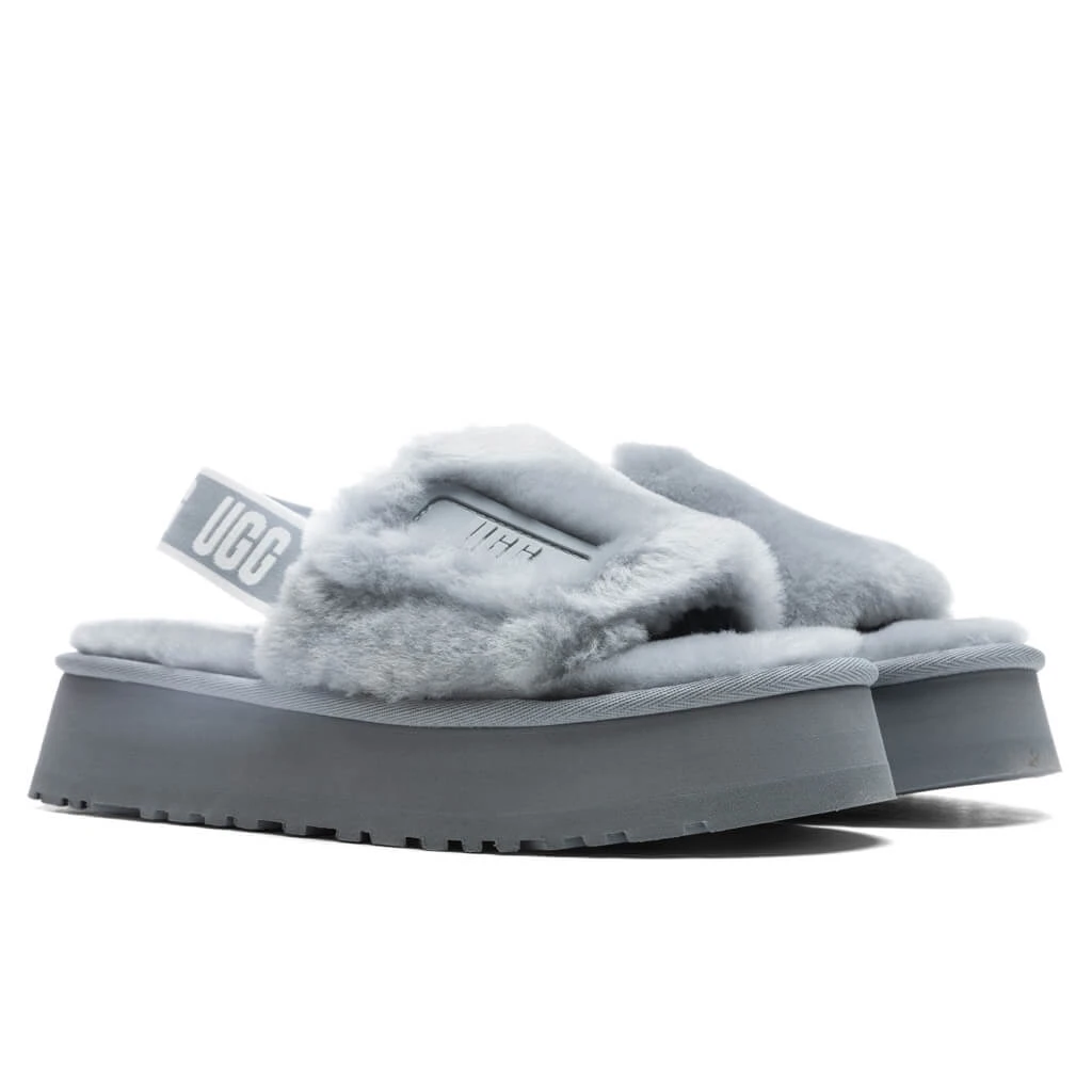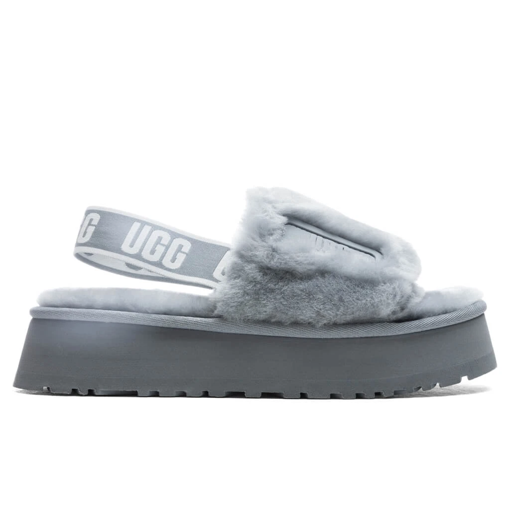 The UGG Womenโs Disco Slide features a sheepskin upper for optimal comfort, while the webbing vamp strap and metal buckle provide security to the construction. A sheepskin insole is placed while the graphic molded EVA outsole offers optimal durability and traction. The woven label at the insole completes the design.